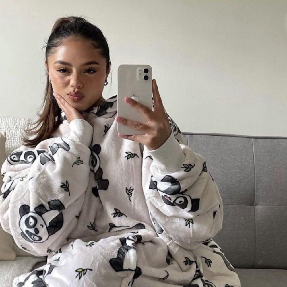 Cozzie är en supermjuk, bärbar filt med fluffig sherpa-insida och lätt yttertyg. Stor nog för alla – och känns som att bli kramad av ett moln.